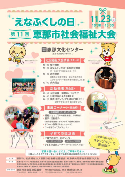 ボランティアや福祉関係者が一堂に会し、福祉活動の発表や情報交換など交流を目的とした「えなふくしの日」と福祉功労者への著彰を行う「社会福祉大会」を一体的に開催いたします。どなたでもご参加いただけます。ぜひ、お気軽にご参加ください。