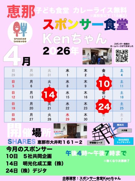 「スポンサー食堂KENちゃん」の4月活動日のお知らせ