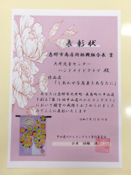 第16回中山道のれんコンテストで大井児童センターハンドメイドクラブののれん「しあわせな花束をあなたに」が、
