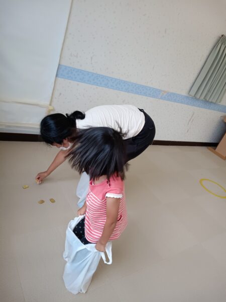 こちらは親子遊びの「小判集め」です。ビニール袋の中に両足を入れジャンプしながら移動し小判を集めました。