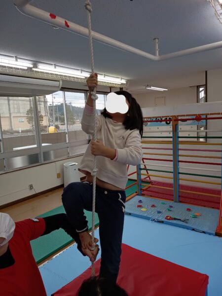 ロープ登りの術では、ロープのこぶに足指をかけて、手足に力を込めながら天井まで登ります。