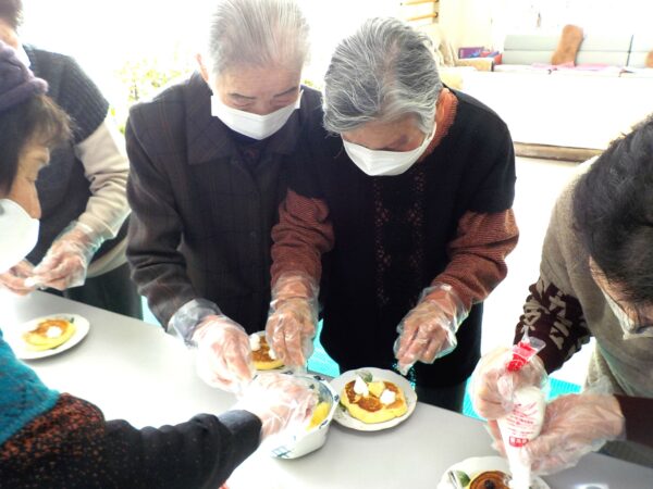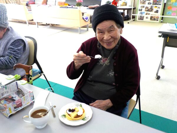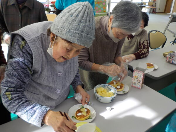 ご利用者様は「懐かしいね」「昔よく作ったよ」とホットケーキを焼き、フルーツと生クリームのトッピングをされました。