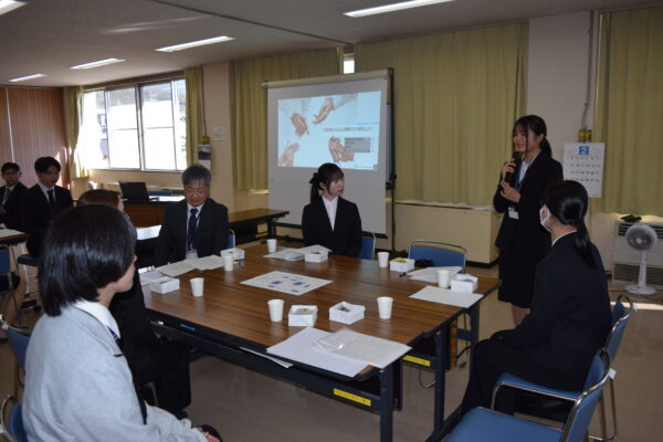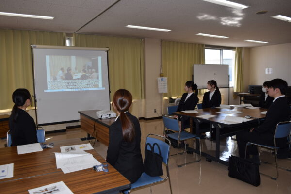 先輩職員が司会者からインタビュー形式で「恵那市社協のよいところ」「仕事のやりがいは?」とか色々な質問を受け発表したあと、