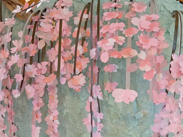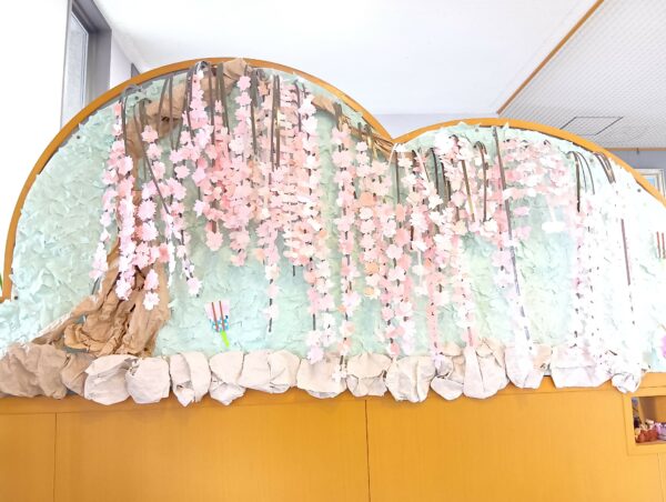 外でも桜が満開な時期になりましたが、岩村デイサービスの玄関も桜が満開です。