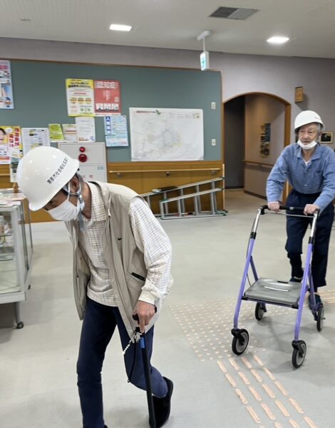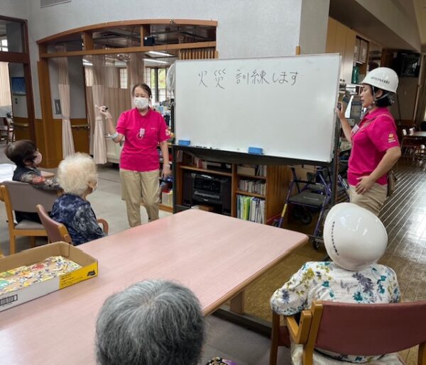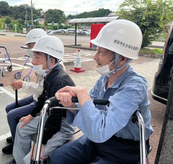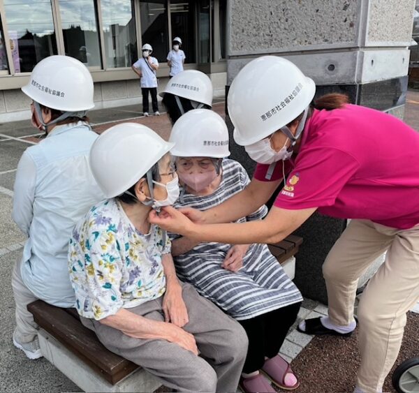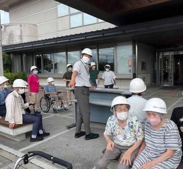 デイサービスの利用者様と職員も参加し、ヘルメットをかぶって安全な場所へ避難する訓練を行ったり、有事に備えた訓練を行いました。