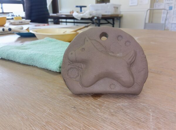 力を込めて型に粘土をはめて、かわいらしい午の形ができあがりました。