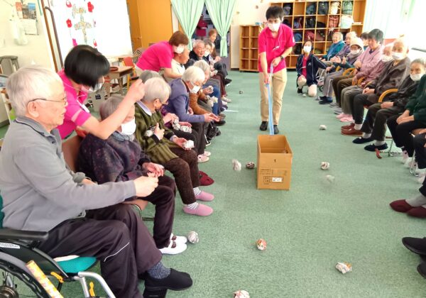 明智デイサービスでは、節分の1週間、レクリエーションにて豆まきゲームと玉入れゲームをご利用者様に楽しんでいただきました。