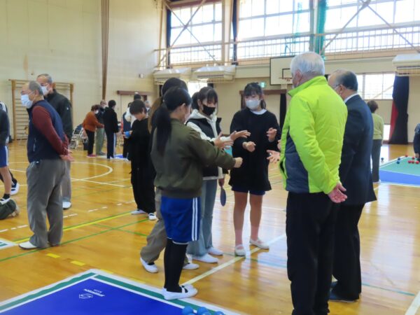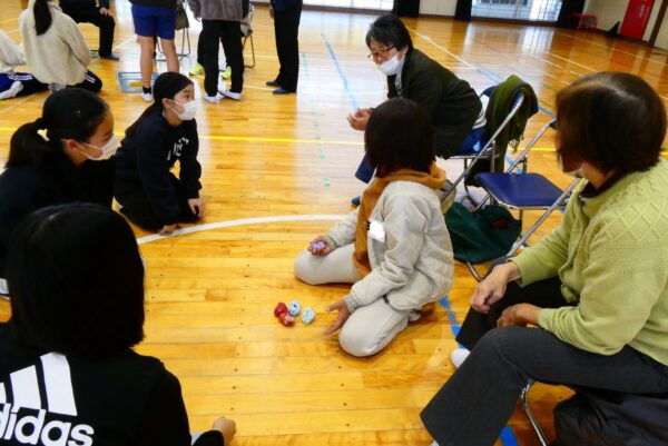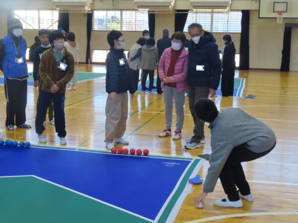 ボッチャを一緒に行い、後半はあやとりやお手玉、福笑いなど昔遊びをみなさんで楽しみました。