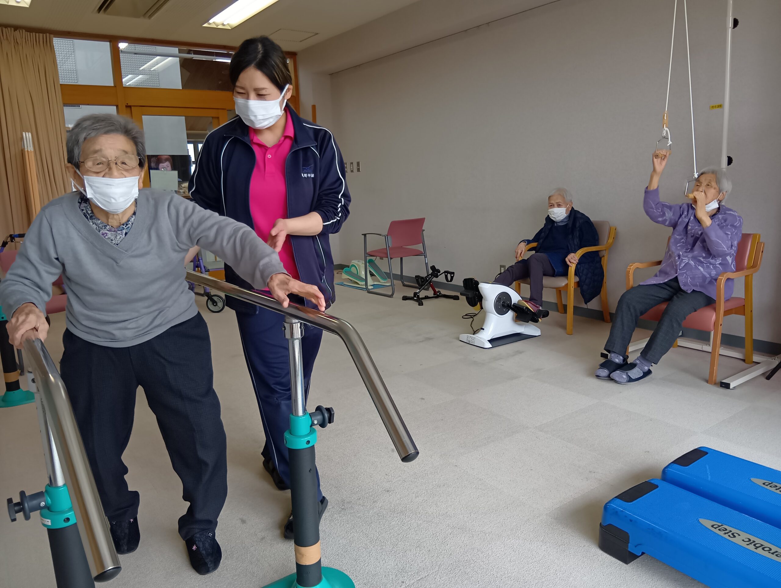 また、1往復100mある福祉センター内を活用した歩行訓練や、作業療法士によるオリジナルの機能訓練を実施し、日常生活動作の筋力維持に努めています。