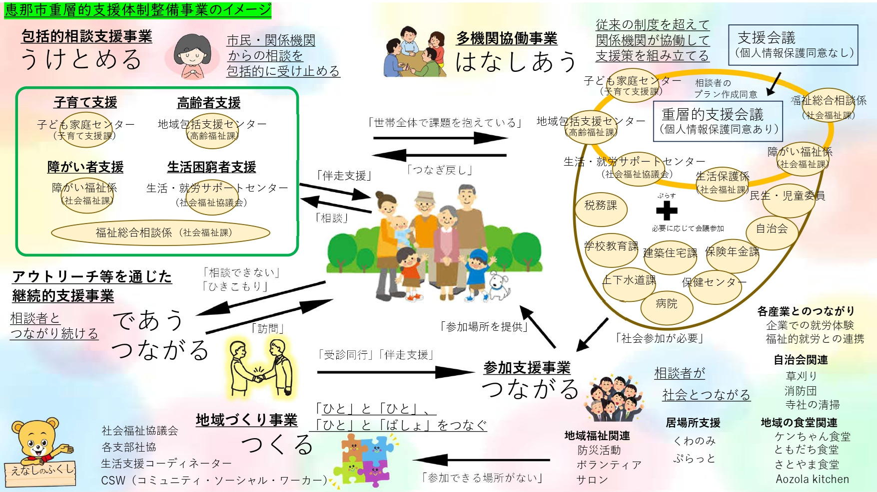 恵那市社会福祉協議会では恵那市から重層的支援体制整備事業について、「多機関協働事業」、「アウトリーチ等を通じた継続的支援事業」、「参加支援事業」、「地域づくり事業」を受託しています。